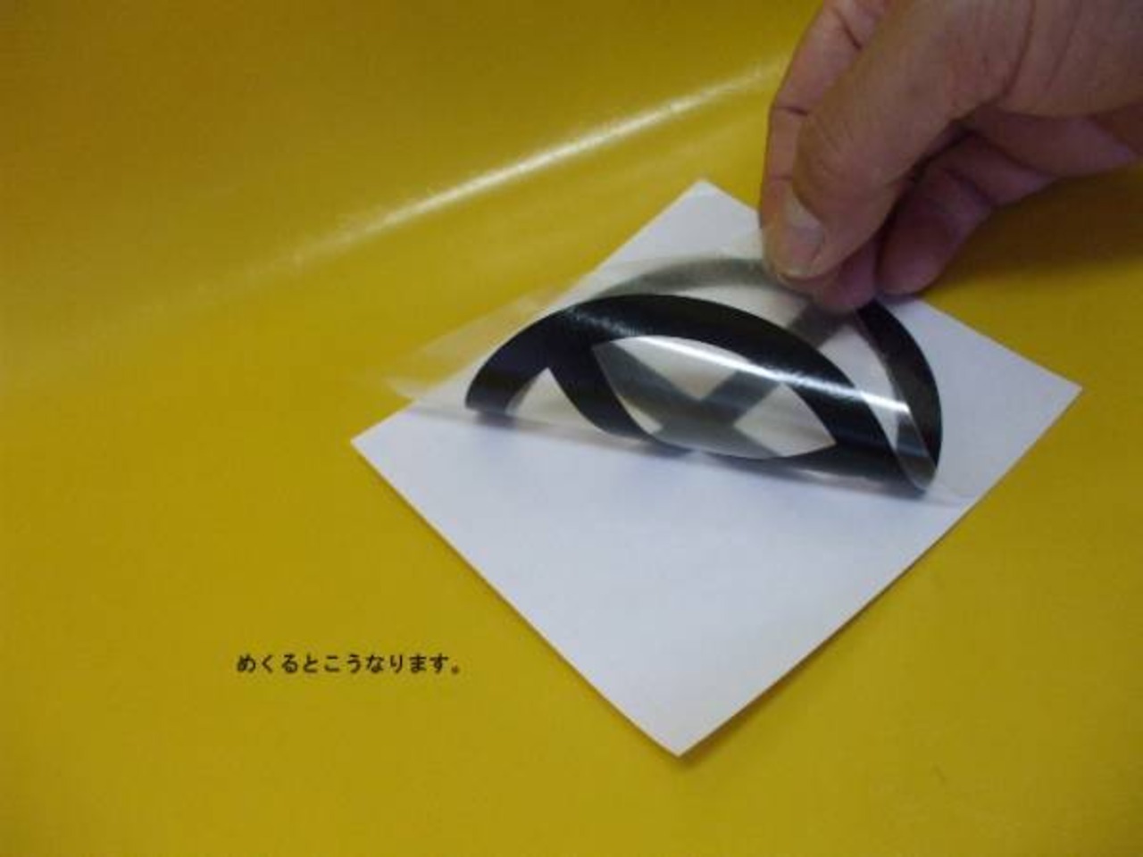■透明転写シートと共に本体シールを台紙より剥がし、貼りつけ箇所に圧着して下さい。透明転写シート上より固いもの(ビン底・ヘラなど)でこすり、十分な接着をご確認の上、ゆっくりと透明転写シートのみを剥離して下さい。